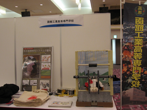 函館高専ブースでは,①地域密着型ロボット『MYCAL』,②牛の発情検知システム,③函館山夜景ビューア,④3DプリンタおよびNC加工機等での制作物を展示しました。