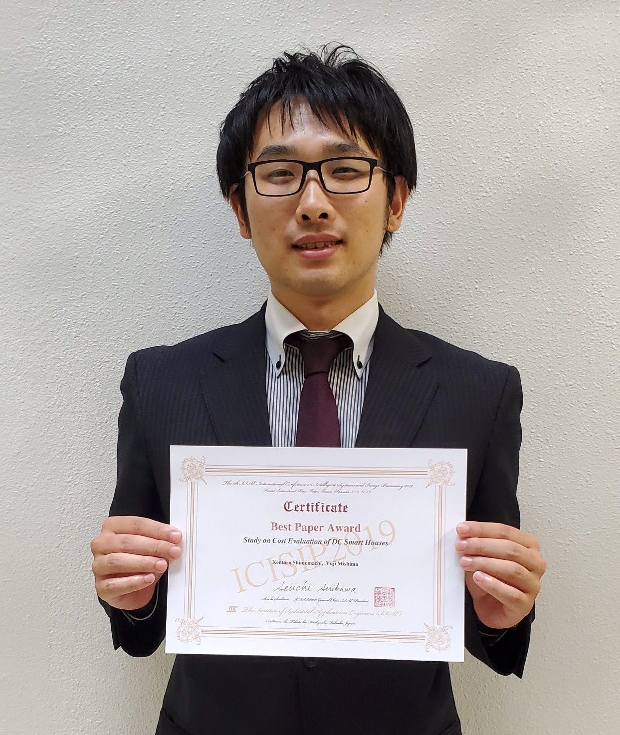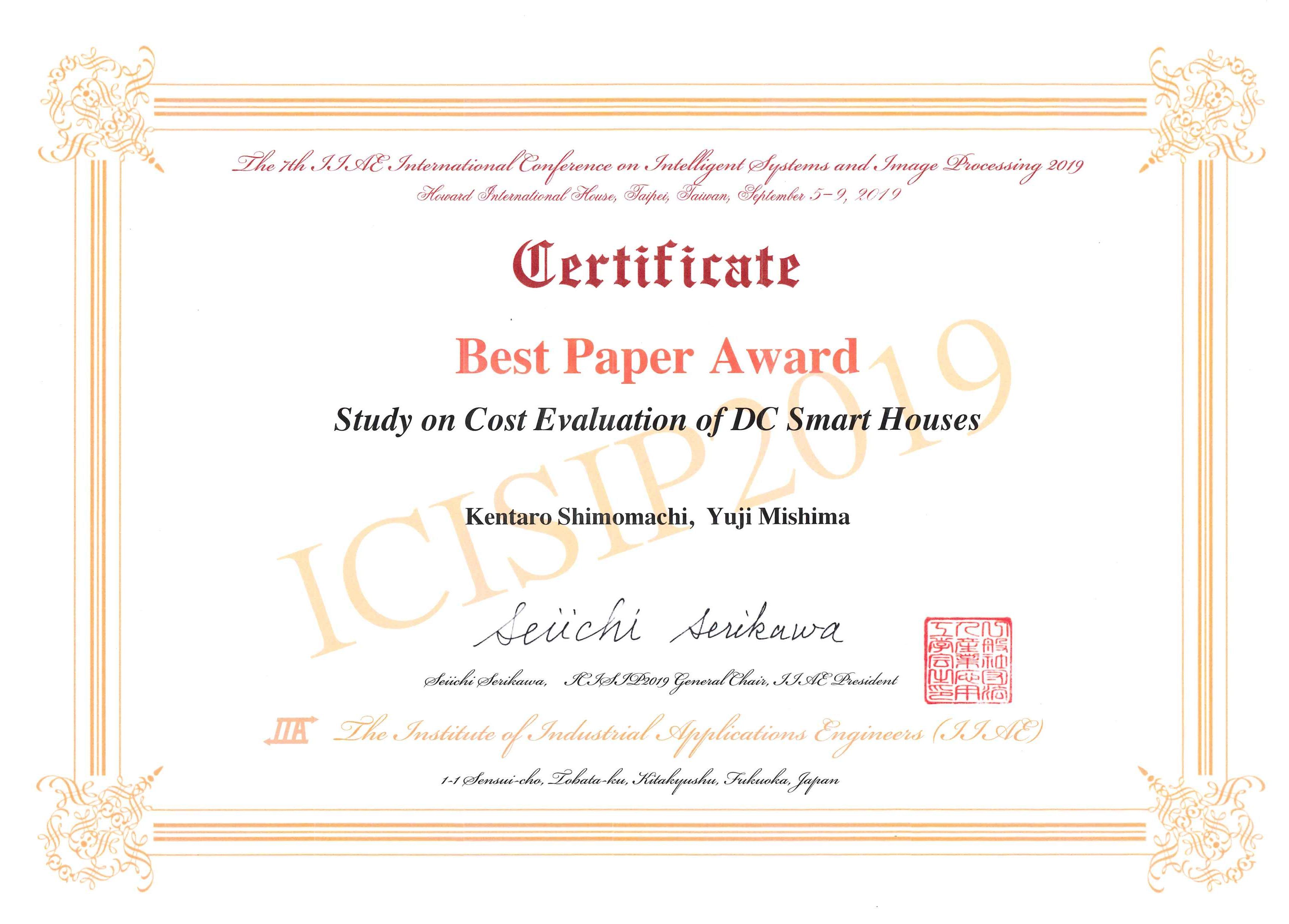 2019年9月6日(金),台湾台北市Howard International Houseで行われたThe 7th IIAE International Conference on Intelligent Systems and Image Processing 2019(ICISIP2019)において,生産システム工学科助教下町健太朗,同教授三島裕樹がBest Paper Awardを受賞しました。発表題目は「Study on Cost Evaluation of DC Smart Houses」です。この研究は,住宅でのエネルギー利用をスマート化する「スマートハウス」を群によって運用する際,その給電方式として,交流方式と直流方式のどちらを選択するべきかを,コストの面から定量的に比較したものです。