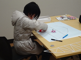 このうちストローを使った橋づくりでは、「軽さと強さの両立」と「美しい・かっこいいデザイン」を各自が考え、方眼紙に設計図を描き、それに合わせストローを切りセロテープでつなぎ合わせ、橋の模型を完成させました。