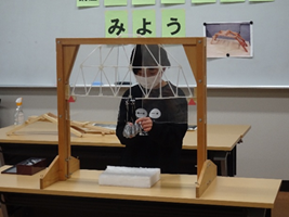 製作した橋に重りを吊り下げる様子