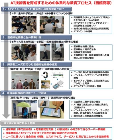 本校では、AT教育のモデル化として本科4年から専攻科1年までの体系的な教育プロセスを設定し、本科ではATの基本に対する理解や実験、専攻科では支援機器開発に基づく課題解決への取り組みを中心に行っています。