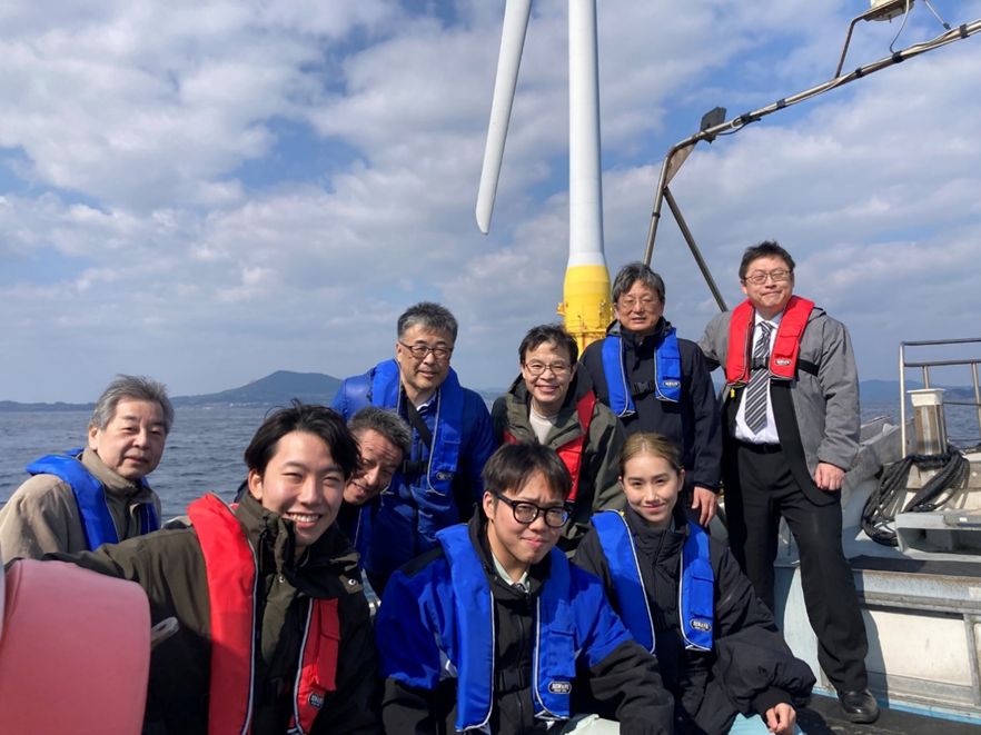 五島市沖の浮体式洋上風力発電施設を背景に、船上で撮影した集合写真