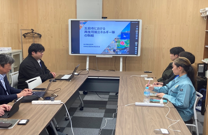 五島市における再生可能エネルギー等の取組について説明を受けている様子
