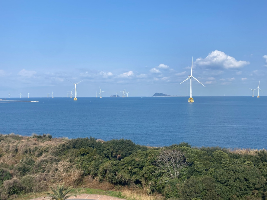 長崎県五島市では、五島市沖に設置されている浮体式洋上風力発電施設を見学しました。この施設は日本初の商用浮体式洋上風力発電施設であり、実際の設備を間近で見ることで、洋上風力発電の技術や運用について理解を深める機会となりました。また、五島市でゼロカーボンシティの取組を担当されている方との懇談の機会もあり、再生可能エネルギーと地域振興との関係について理解を深めることができました。