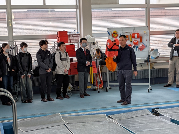 洋上サバイバル装備の説明の様子(訓練用プールで撮影)