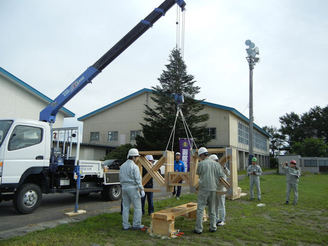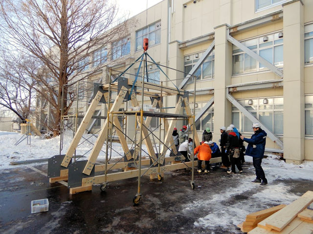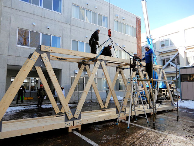 ツーバイエイト材を使用した災害復旧用ワーレントラス橋の架設実験(2019.12.7)