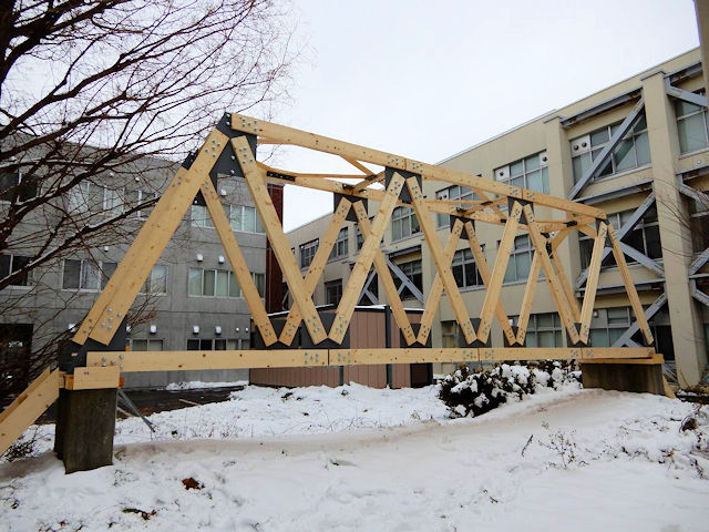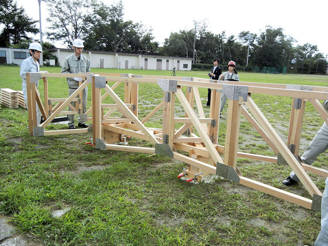 として活用することができます。 This is a warren truss bridge using 2-by-8 timber as structural materials in the market. It is possible to decrease the cost and the time to construct. This bridge is also useful as an emergency bridge for recovery from disasters. |