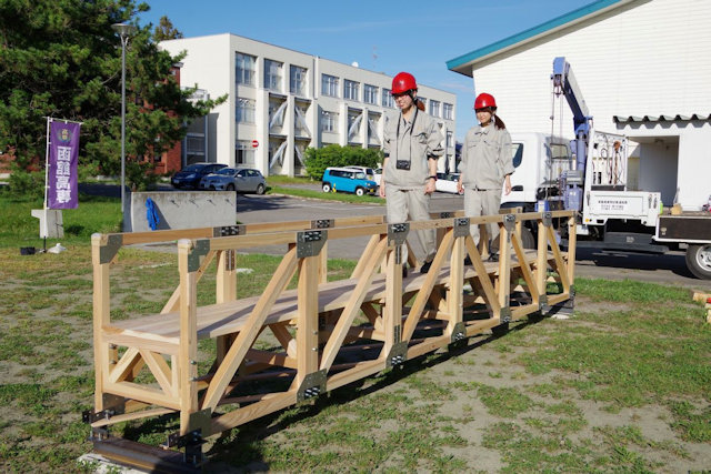 災害復旧用折り畳み式木製ハウトラス橋の架設実験(2019.9.18)