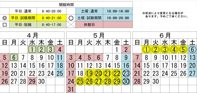 (定期試験開始2週間前から最終日の前日までの間は、平日は21時、土曜日は20時まで開館)