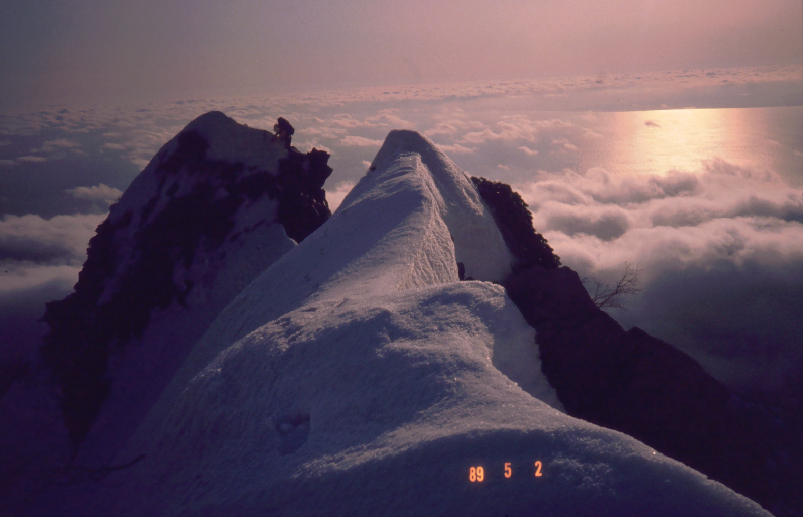 Photo 2. Mt.Porosiri (central peak) and Mt.Tottabetu (right peak) in morning sunshine. (Photo from an Attack Camp)